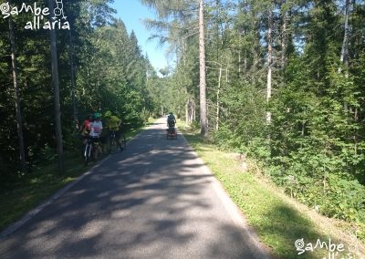 Dopo un’abbondante colazione ripercorriamo a ritroso qualche km, ripassiamo davanti alla stazione e procediamo in salita verso il confine sloveno. La ciclabile è quasi tutta asfaltata e sempre in leggera salita attorno al 3-4%. Prima del confine troviamo la deviazione per i laghi di Fusine. Sicuramente avrebbero meritato una visita ma senza carico al seguito. Se volete vederli vi consiglio almeno un giorno in più così da abbinarci anche una passeggiata all’Orrido della Slizza che richiede circa 1.30h di camminata. In pochi chilometri, una decina scarsa raggiungiamo il confine e dopo le foto di rito il percorso prosegue pianeggiante e poi in leggera discesa fino a kranjska. In questa tratta trovate alcuni chioschi. Noi stanchi dalla levataccia troviamo posto al Nature Eco Camp. Qui è tutto “eco” o quasi: si paga solo in contanti, non esistono piazzole, niente corrente (per ricaricare i dispositivi elettronici si condivide una ciabatta in reception), doccia calda solo la sera; però se non siete attrezzati per la cena c’è un’area cucina attrezzata, un area barbecue e dei tavolini da condividere. Ci sono poltrone in legno per l’area relax, delle altalene di stoffa e corda appese ai rami e una zona falò dove la sera si mangiano i mash mellow 🙂